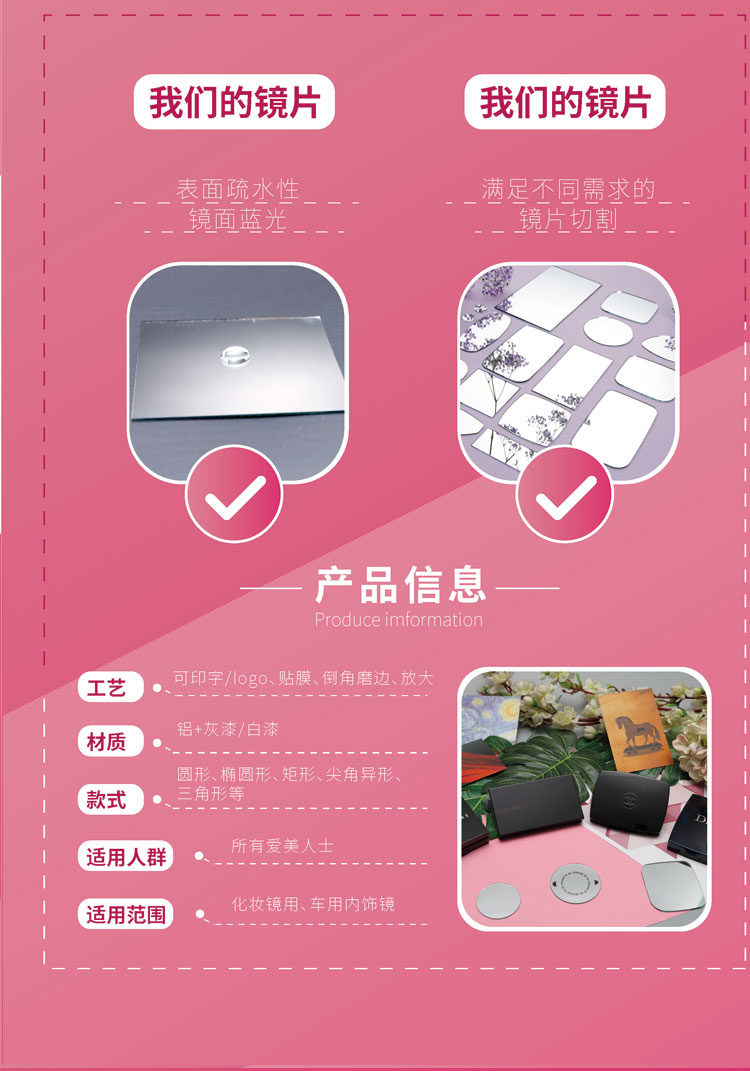 通過多項專利技術(shù)制造,實現(xiàn)超薄、防碎、亮膚美顏、防霧化等功效,被廣泛應(yīng)用于粉餅盒化妝鏡、口紅鏡等美容美妝用品系列,被國家科學(xué)技術(shù)委員會等國務(wù)院部委授予“國際級重點新產(chǎn)品”證書,產(chǎn)品銷往日本、歐美等地,為多個國際頂級化妝品牌合作